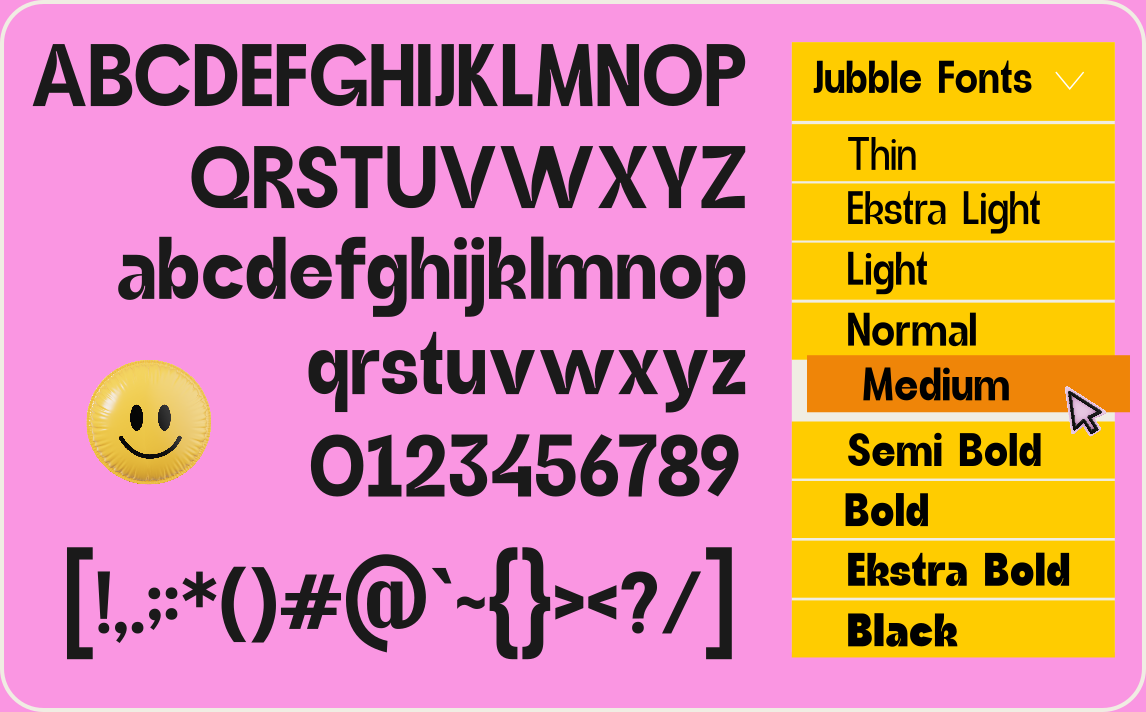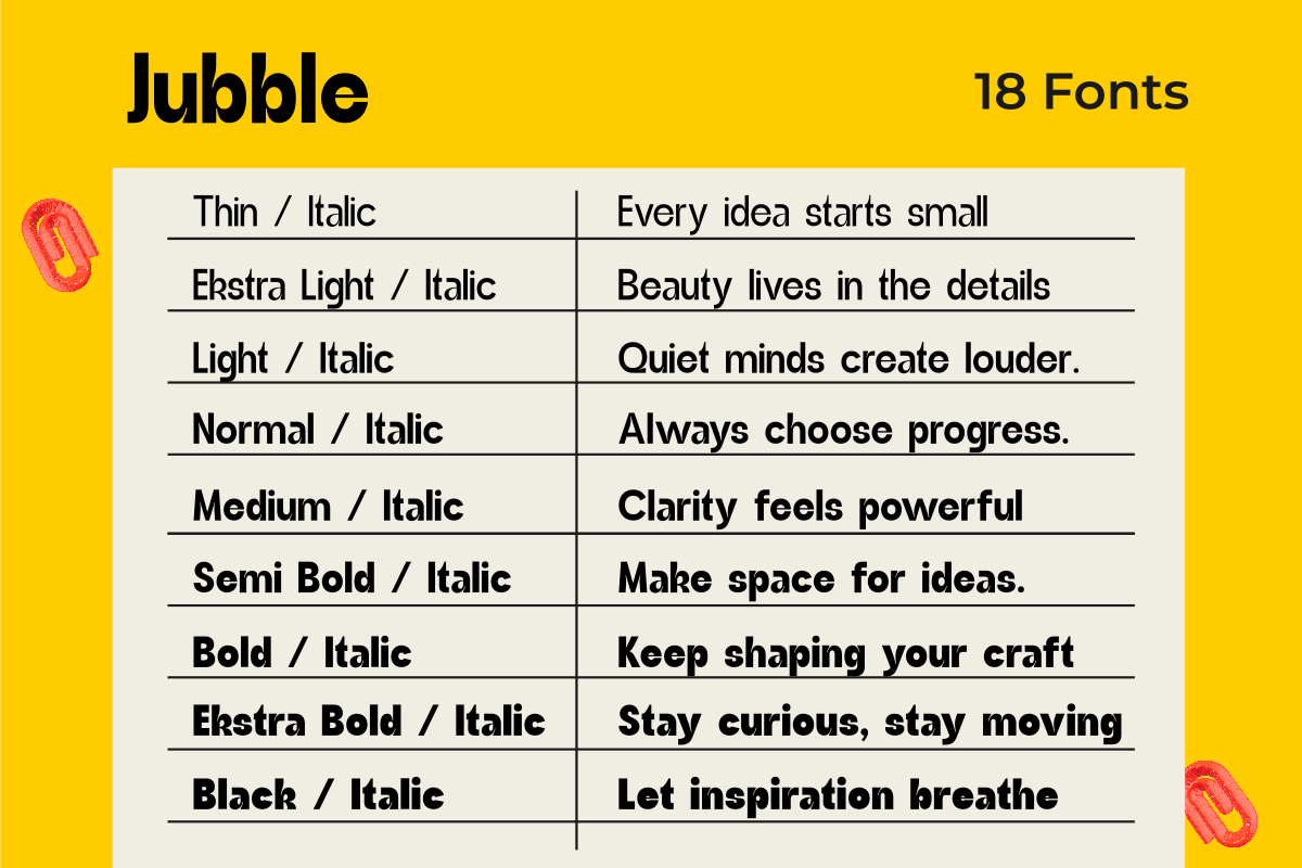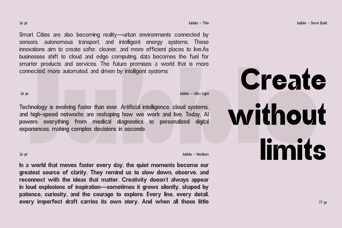 With weights ranging from Thin to Black, Jubble gives you full creative flexibility — whether you need elegant light text, balanced regular paragraphs, or bold, standout headlines. Each weight is crafted to maintain clarity, consistency, and a warm modern character across all sizes.